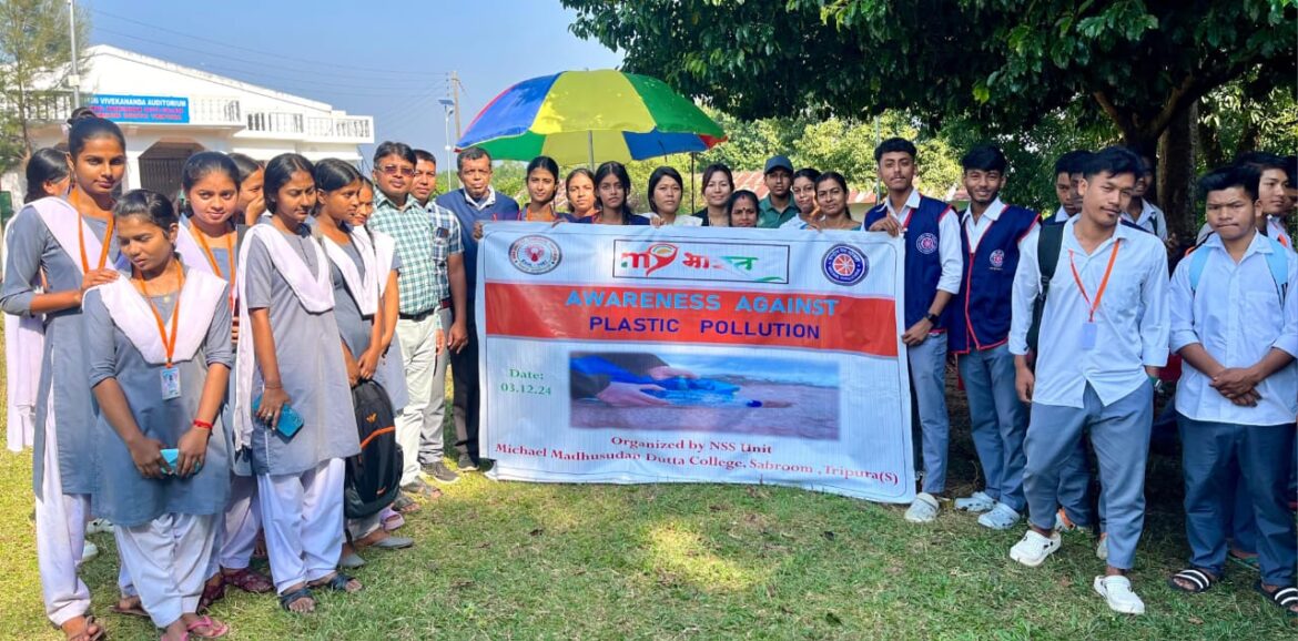 সাব্রুম মাইকেল মধুসূদন দত্ত কলেজের জাতীয় সেবা প্রকল্পের(এনএসএস) উদ্যোগে আজ এক সচেতনতামূলক কর্মসূচীর আয়োজন করা হয়। উপস্থিত ছিলেন কলেজ এনএসএস ইউনিটের অভিযোজিত বিবেকানন্দ পল্লী ও দমদমা গ্রামপঞ্চায়েতের প্রধান মিনতী দাস ও প্রসেনজিৎ দাস, গ্রামের বিশিষ্ট নাগরিকবৃন্দসহ এনএসএস প্রোগ্রাম অফিসার অধ্যাপক অরূপ পাটারী, সেচ্ছাসেবকসহ ছাত্রছাত্রী ও অধ্যাপক-অধ্যাপিকাবৃন্দ। প্রতিনিয়ত প্লাস্টিক পদার্থের ব্যবহার, পলিথিন ব্যাগ, কসমেটিক, গৃহস্থলির প্লাস্টিক, বানিজ্যিক কাজে ব্যবহৃত প্লাস্টিক পন্যের ব্যবহার যা “অবিয়োজন যোগ্য পদার্থ” পরিবেশে দূষণের মাত্রা বাড়িয়ে দিচ্ছে। প্লাস্টিক এমন