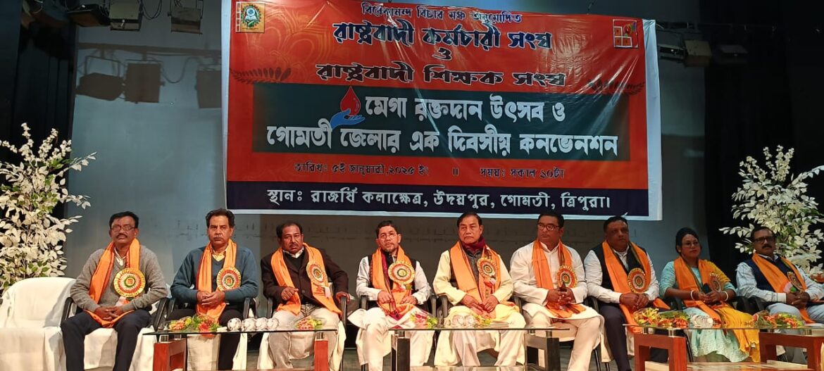 - প্রতিনিধি, উদয়পুর :- রবিবার উদয়পুর রাজর্ষি কলাক্ষেত্রে বিবেকানন্দ বিচার মঞ্চ অনুমোদিত রাষ্ট্রবাদী কর্মচারী সংঘ ও রাষ্ট্রবাদী শিক্ষক সংঘের উদ্যোগে আয়োজিত মেগা রক্তদান উৎসব ও গোমতী জেলার এক দিবসীয় কনভেনশন অনুষ্ঠিত হয়। অনুষ্ঠানে প্রদীপ প্রজ্জ্বলন ও স্বামী বিবেকানন্দের প্রতিকৃতিতে পুষ্পস্তবক অর্পণ করে শুভ সূচনা করেন বিধায়ক রামপদ জমাতিয়া। এছাড়াও উপস্থিত ছিলেন রাজ্য মজদুর মনিটরিং সেলে সভাপতি বিপ্লব কর, রাজ্য মজদুর মনিটরিং সেলের ও আশা ফেসিলেটর সম্পাদিকা সেবিকা চৌধুরী, বিবেকানন্দ বিচারমঞ্চের রাজ্য কমিটির সদস্য দীপেন ভৌমিক, রাজ্য মনিটারিং সেলের সদস্য বিপ্লব দাস সহ আরো অনেকে। অনুষ্ঠানে ৫১ জন রক্তদাতা রক্তদান করেন। এক দিবসীয় কনভেশন অনুষ্ঠান শেষে বিধায়ক রাম পদ জমাতিয়া বক্তব্য রাখতে গিয়ে বলেন , কর্মচারীদের বদলির কথা চিন্তা না করে কর্মক্ষেত্রে আরও অধিক মনোনিবেশ করার আহবান জানান এবং কাজের ফাঁকে নিজেদেরকে অর্থনৈতিকভাবে অধিকতর সমৃদ্ধ করার জন্য বিকল্প কর্মসংস্থানের দিকে মনোনিবেশ করার আগ্রহ প্রকাশ করেন।