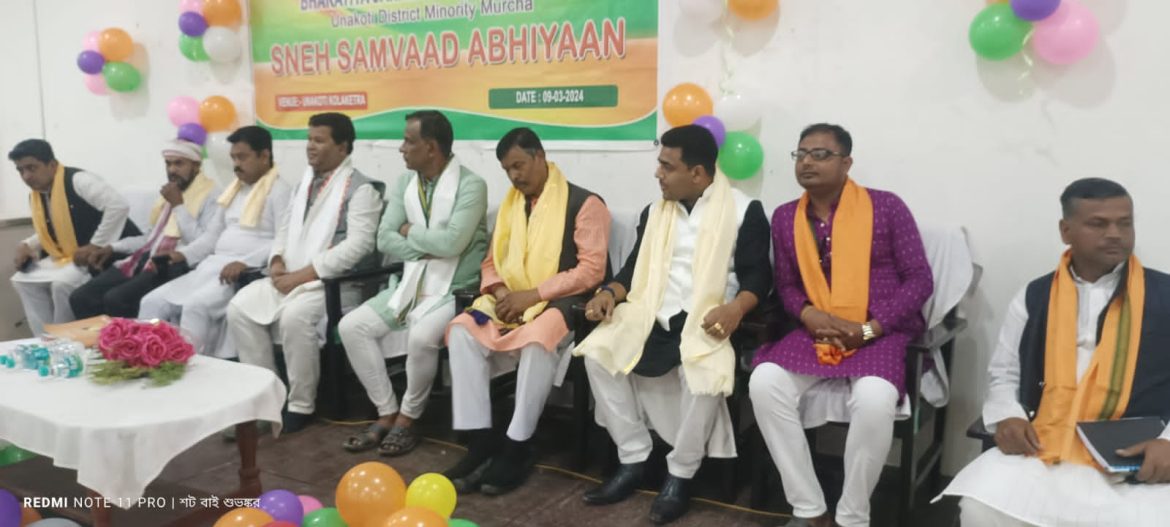 প্রতিনিধি কৈলাসহর:- সংখ্যালঘু মোর্চার উদ্যোগে স্নেহ সম্ভাদ অভিযানের অঙ্গ হিসেবে শনিবার দুপুর বেলা কৈলাসহর ঊনকোটি কলাক্ষেত্রে একটি হল সভা অনুষ্ঠিত হয়।এদিনের এই কর্মসূচিতে উপস্থিত ছিলেন বিজেপি সংখ্যালঘু মোর্চার রাজ্য সভাপতি বিল্লাল মিয়া, রাজ্য ওয়াকফ বোর্ডের চেয়ারম্যান মবসর আলী, বিজেপি কিষান মোর্চার রাজ্য কমিটির সহ-সভাপতি আব্দুল গফফার,ঊনকোটি জেলার বিজেপির সভাপতি পবিত্র দেবনাথ,জেলা সংখ্যালঘু মোর্চার সভাপতি আকতারুল হোসেন বাবুল,বিজেপি সংখ্যালঘু মোর্চা রাজ্য কমিটির সাধারণ সম্পাদক গিয়াসউদ্দিন আহমেদ লাভলু, মন্ডল সাধারণ সম্পাদক প্রশান্ত দে,আব্দুল মুনিম থেকে শুরু করে বিজেপি সংখ্যালঘু মোর্চার অন্যান্য নেতৃত্বরা এদিনের এই কর্মসূচিতে উপস্থিত ছিলেন। মূলত আসন্ন লোকসভা নির্বাচনকে সামনে রেখেই এদিনের এই কর্মসূচি অনুষ্ঠিত হয়।প্রদীপ প্রজ্জলন করে উক্ত সভার উদ্বোধন করেন বিজেপি সংখ্যালঘু মোর্চার রাজ্য কমিটির সভাপতি বিল্লাল মিয়া। বক্তব্য রাখতে গিয়ে নেতৃত্বরা রাজ্য সরকার ও কেন্দ্র সরকারের বিভিন্ন উন্নয়নমূলক কাজকর্ম নিয়ে আলোচনা করেন।পাশাপাশি আসন্ন লোকসভা নির্বাচনে কিভাবে পূর্ব ত্রিপুরা আসনটি দেশের প্রধানমন্ত্রী নরেন্দ্র মোদীকে উপহার দেওয়া যায় সেইসব বিষয় নিয়েই আজকের সভায় আলোচনা করা হয়।
