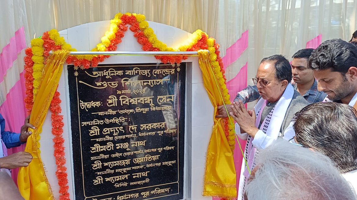 শনিবার শিবরাত্রির শুভক্ষণে ধর্মনগর মহাশ্মশানে ইলেকট্রিক চুল্লি এবং রানা দিঘির পারে মার্কেট স্টলের শিলান্যাস করলেন ধর্মনগরের বিধায়ক তথা রাজ্য বিধানসভার অধ্যক্ষ বিশ্ববন্ধু সেন। উপস্থিত ছিলেন পুরো পরিষদের চেয়ারম্যান প্রদ্যুৎ দে সরকার, ভাইস চেয়ারম্যান মনজু রানী নাথ, বিশিষ্ট সমাজসেবী শ্যামল নাথ এবং পুরো পরিষদের চিফ এক্সিকিউটিভ অফিসার শ্যামজয় জমাতিয়া। উল্লেখ্য মার্কেট স্টলে বরাদ্দ রয়েছে তিন কোটি দুই লক্ষ ৫৭৯৪৭ টাকা এবং ইলেকট্রিক চুল্লির জন্য ব্যয় হবে এক কোটি ৯ লক্ষ ৯৫৫১ টাকা। উদ্বোধন করে অধ্যক্ষ বলেন রাজ্যে উন্নয়নের জোয়ার বইছে। আগে একটা সময় ছিল শুধু নেই নেই নিপীড়িত শোষিত বঞ্চিত পরস্ত্রী কাতর এই করে করে 25 টা বছর আমাদেরকে পিছিয়ে দেওয়া হয়েছিল। কোন কিছু না করে শুধু আন্দোলন আর আন্দোলন। বাস্তবে আন্দোলনের কোন ফলপ্রসূ প্রভাব পরিলক্ষিত হতো না। এখন আন্দোলন না করি একের পর এক উন্নয়ন হয়ে চলেছে। দেশের প্রধানমন্ত্রী নরেন্দ্র মোদির নেতৃত্বে দেশের প্রতিটি স্তরের মানুষের উন্নয়ন সাধিত হচ্ছে। এখন আর আন্দোলন করে ন্যায্য পাওনা গুলি পেতে হয় না এমনিতেই সরকার মুখিয়ে আছে মানুষের ন্যায্য পাওনা যেগুলি উন্নয়নমুখী কেমন করে সেগুলি দেওয়া সম্ভব। পুরো পরিষদের চেয়ারম্যান বলেন প্রতিটি মার্কেট স্টলের ঘর হবে ১১ ফুট এবং সাত ফুট মাপের অর্থাৎ প্রতিটি ঘরের ক্ষেত্রফল দাঁড়াচ্ছে ৭৭ বর্গফুট করে। যেকোনো ব্যবসায়ের ক্ষেত্রে একটা সঠিক প্রমাণ মাপ বলে বর্ণনা করা হয়। আরো কি কি উন্নয়নের পরিকল্পনা রয়েছে তা উপস্থিত অতিথিদের বক্তব্যে ফুটে ওঠে।