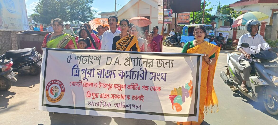 প্রতিনিধি, উদয়পুর :- ৫ শতাংশ মহার্ঘ ভাতা প্রদানের জন্য ত্রিপুরা রাজ্য কর্মচারী সংঘ গোমতী জেলা ও উদয়পুর মহকুমা কমিটির পক্ষ থেকে ত্রিপুরা রাজ্য সরকারকে অভিনন্দন জানিয়ে রবিবার সকাল ১১ টায় জামতলা টাউন হলের সামনে থেকে অভিনন্দন মিছিল বের হয় । মিছিলটি উদয়পুর শহরের বিভিন্ন পথ পরিক্রমা করে । পরে পুনরায় জামতলা টাউন হল সামনে এসে জমায়েত হয়। শেষে এক হল সভায় অংশ নেন প্রতিটি কর্মচারী । মিছিল শেষে সংবাদ মাধ্যমের প্রশ্নের উত্তরে কর্মচারী নেতৃত্বরা জানান , রাজ্য সরকার নানা প্রতিকূলতার মধ্যেও কর্মচারীদের কথা মাথায় রেখে পাঁচ শতাংশ মহার্ঘ ভাতা বৃদ্ধি করেছে। গত ২৫ বছরের বাম সরকার কখনো কর্মচারীদের কথা মাথায় রাখেনি। নিজেদের মর্জি মাফিক চালিয়েছিল কর্মচারীদের। বর্তমান সরকার দৈনন্দিন জীবনে কর্মচারীদের নানা সমস্যার কথা জানতে পেরে তাদের বেতন বৃদ্ধি করার বিষয় ভাবনা চিন্তা করে এবং তার সফল পায় প্রতিটি কর্মচারী। তাই ধন্যবাদ সূচক এই মিছিল করা হয় গোটা উদয়পুর শহরে। আগামী দিনে বকেয়া মহার্ঘ ভাতা মিটিয়ে দেওয়া হবে বলে আশা প্রকাশ করেন কর্মচারী নেতৃত্বরা ।