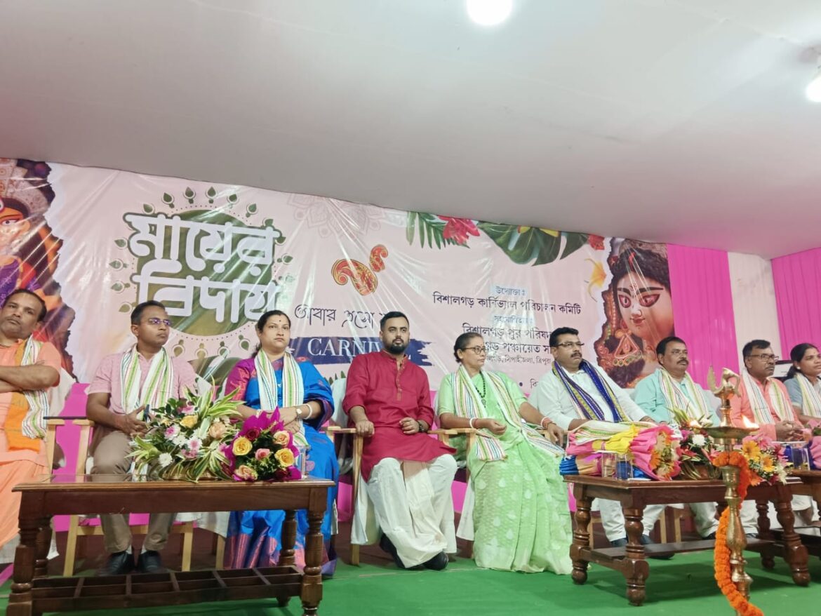 - প্রতিনিধি, বিশালগড়, ১৪ অক্টোবর।। বিশালগড়ে নির্বিঘ্নে সম্পন্ন হল দুর্গোৎসব। সোমবার সাড়া জাগানো কার্নিভালের মাধ্যমে বিদায় জানানো হয় অসুর বিনাশিনী দেবী দুর্গাকে। এবারে দ্বিতীয়বারের মতো কার্নিভাল অনুষ্ঠিত হয়। সুশান্ত দেব বিশালগড়ের বিধায়ক নির্বাচিত হওয়ার পর গত বছর প্রথমবার বিশালগড়ে কার্নিভাল অনুষ্ঠিত হয়। এবারেও তার ব্যতিক্রম ঘটেনি। বিশালগড় মহকুমা প্রশাসন, পৌর পরিষদ এবং বিশালগড় পঞ্চায়েত সমিতির সহযোগিতায় এই কার্নিভাল অনুষ্ঠিত হয়। সোমবার বিশালগড় ব্রিজ চৌমুহনীতে আয়োজিত কার্নিভালের অনুষ্ঠান মঞ্চে উপস্থিত ছিলেন বিধায়ক সুশান্ত দেব, বিধায়ক অন্তরা দেব সরকার, বিধায়ক তোফাজ্জল হোসেন, সিপাহীজলা জেলা সভাধিপতি সুপ্রিয়া দাস দত্ত, বিশালগড় পৌর পরিষদের চেয়ারম্যান অঞ্জন পুরকায়স্থ, বিশালগড় পঞ্চায়েত সমিতির চেয়ারপার্সন অতসী দাস, জেলাশাসক সিদ্ধার্ত শিব জয়সওয়াল, মহকুমা শাসক রাকেশ চক্রবর্তী, জেলা পরিষদের সদস্য গৌরাঙ্গ ভৌমিক, পঞ্চায়েত সমিতির সদস্য তপন দাস প্রমূখ। মহকুমা তথ্য সংস্কৃতি দপ্তর এবং স্থানীয় শিল্পীরা দলগত সংগীত এবং নৃত্য পরিবেশন করেন। এরপর একে একে ক্লাবগুলি সারিবদ্ধভাবে প্রতিমা নিয়ে কার্নিভালে অংশ নেন। ক্লাব গুলির পক্ষ থেকেও অনুষ্ঠান মঞ্চ প্রাঙ্গনে নৃত্য পরিবেশন করেন। সুসজ্জিত কার্নিভালে মোট ১৩ টি ক্লাব অংশ নিয়েছেন। এরপর সরকারি ব্যবস্থাপনায় রঘুনাথপুর বিজয় নদে প্রতিমা বিসর্জন করা হয়। বিধায়ক সুশান্ত দেব ভাষণে বলেন সকলের সহযোগিতায় বিশালগড়ে শান্তি-শৃঙ্খলা রক্ষার মাধ্যমে দুর্গোৎসব অনুষ্ঠিত হয়। সাম্প্রতিক বন্যায় চরম ক্ষতি হয়েছে বিশালগড়ের। এরপরেও এলাকার সনাতনী সমাজ দুর্গোৎসবের আনন্দে মেতে উঠেছে। কার্নিভালে বিভিন্ন ক্লাবগুলি অংশগ্রহণ এক ইতিবাচক বার্তা বহন করে। আমরা সবাই মিলে দেবী দুর্গার আশীর্বাদ বিশালগড় কে শ্রেষ্ঠ বিশালগড় হিসেবে গড়ে তুলবো। কার্নিভালকে কেন্দ্র করে সোমবার বিকাল থেকেই সাজো সাজো রব বিশালগড়ে। সন্ধ্যা রাতে কার্যত জন ঢল নামে। কার্নিভাল উপভোগ করতে কয়েক হাজার নর নারী উপস্থিত ছিলেন।