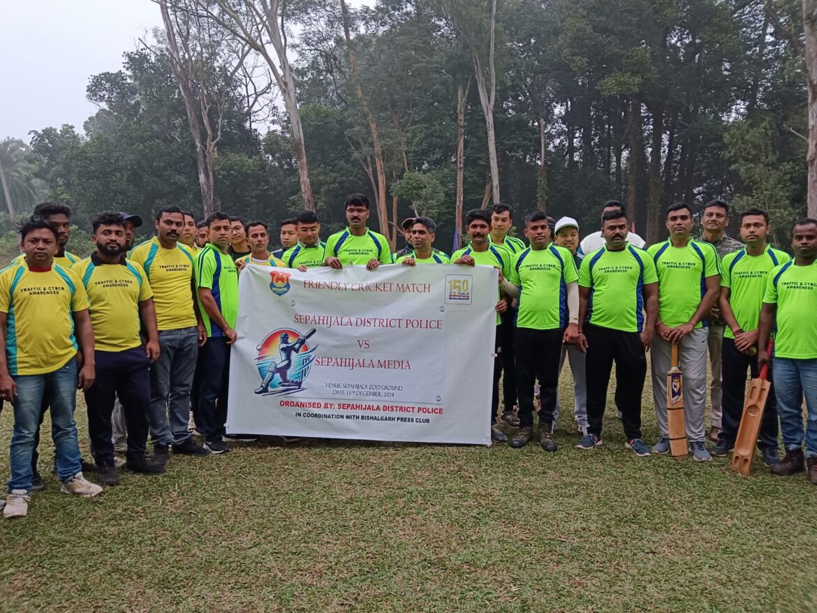 প্রতিনিধি, বিশালগড় , ১৩ ডিসেম্বর।। সিপাহীজলা জেলা পুলিশ এবং জেলার সাংবাদিকদের মধ্যে প্রীতি ক্রিকেট ম্যাচ অনুষ্ঠিত হয়। শুক্রবার বিকালে সিপাহীজলা জু মাঠে আয়োজিত ম্যাচে প্রথমে ব্যাট করে নির্ধারিত ৮ ওভারে ৮ উইকেট হারিয়ে ৬৪ রান করে সাংবাদিক একাদশ। সাংবাদিক পক্ষে জেলা শাসক ড: সিদ্ধার্থ শিব জয়সওয়াল ২৩ রান করে। মান্নান হক ৭ রান করে। পুলিশ দলের আরপি সিং এবং ময়নাল ৩ টি করে উইকেট পায়। জবাবে খেলতে নেমে ৬.১ ওভারে ৪ উইকেট হারিয়ে জয়ের লক্ষ্যে পৌঁছে যায় পুলিশ একাদশ। বিজয়ী দলের আরপি সিং ৪০ জেলা পুলিশ সুপার বি জে রেড্ডি ৭ রানে অপরাজিত থাকে। ম্যান অব দি ম্যাচ আর পি সিং এর হাতে পুরস্কার তুলে দেন বিশালগড় প্রেস ক্লাবের সভাপতি ভবতোষ ঘোষ। রানার্স দলের হাতে ট্রফি তুলে দেন এসপি বি জে রেড্ডি, অতিরিক্ত জেলা পুলিশ সুপার রাজীব সুত্রধর সহ জেলার পুলিশ আধিকারিকরা। বিজয়ী দলের হাতে ট্রফি তুলে দেন বিশালগড় প্রেস ক্লাবের সম্পাদক তাজুল ইসলাম, সহসভাপতি সমীর ভৌমিক, সহসম্পাদক খোকন ঘোষ প্রমুখ।